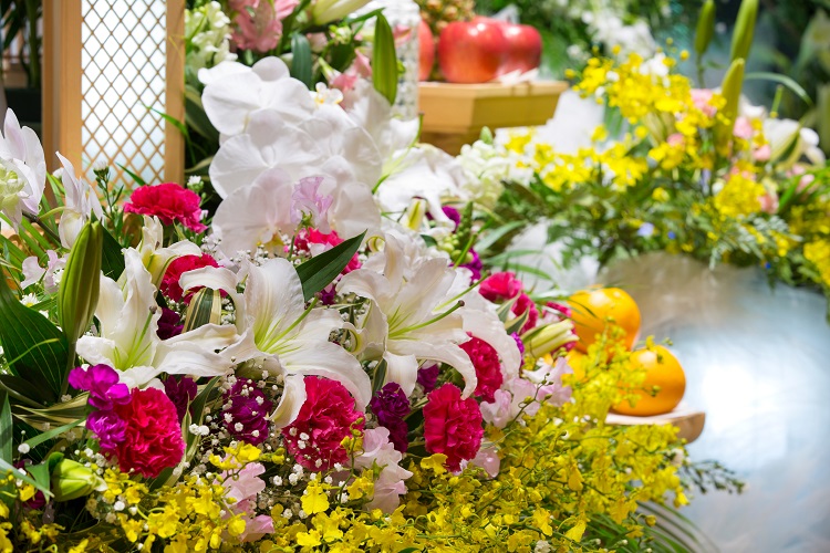 祭壇脇に飾られる供花や果物などの供物については、本数や個数に応じて金額が変動します。なお、供花についてはお花のボリュームに応じて、1基あたり15,000円〜40,000円程度の仕様から選ぶことが可能です。