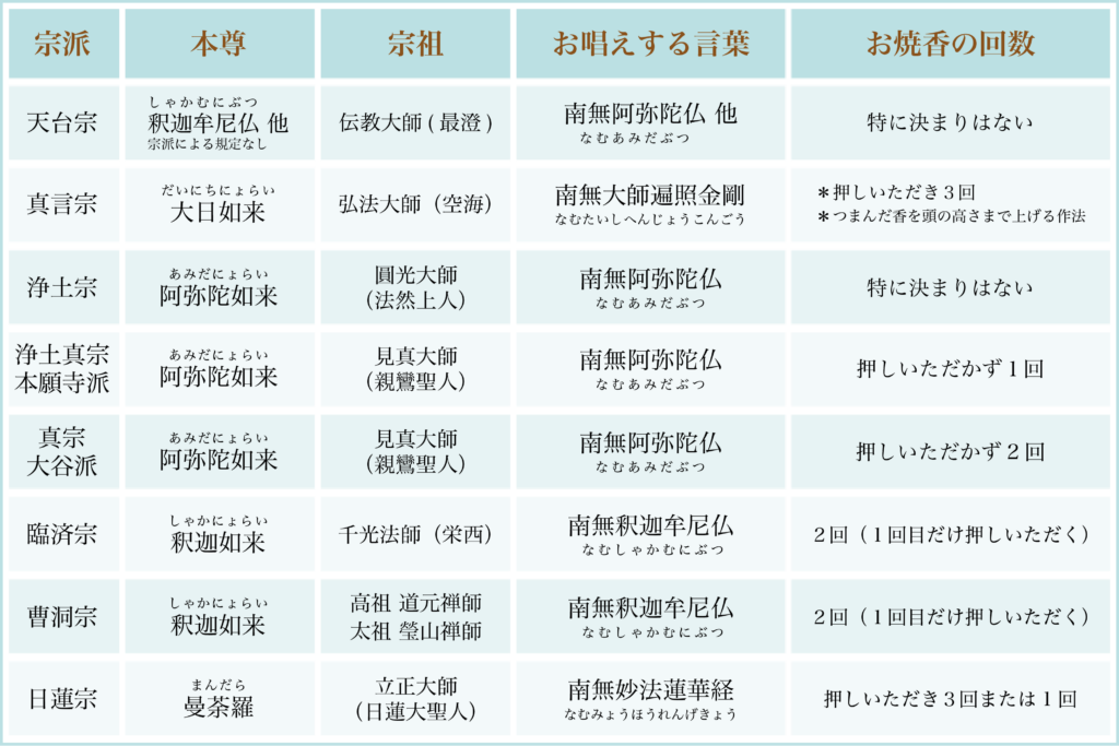 仏式の葬儀では、お焼香で故人様を供養します。焼香は香をつまみ、隣の香炉に落として焚くという手順でおこない、焚く回数や作法は各宗派によって様々です。数多くある日本の仏教宗派の中でも、代表的なのが「日本八宗」と呼ばれる、8つの宗派です。