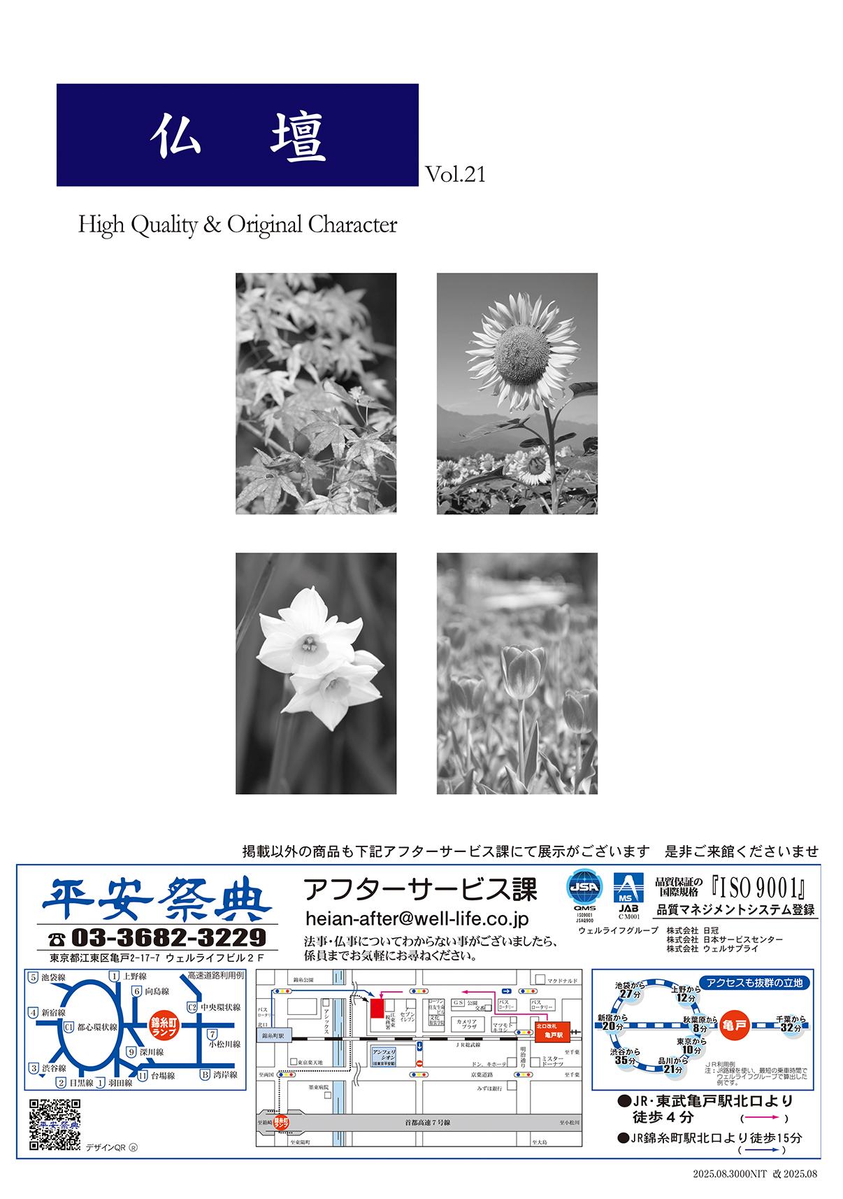 東京都江東区のJR亀戸駅から徒歩4分の仏壇仏具の専門店[平安祭典アフターサービス課]のショールームでは、ご来店のお客様限定の特別価格にて、お仏壇を展示販売いたしております。