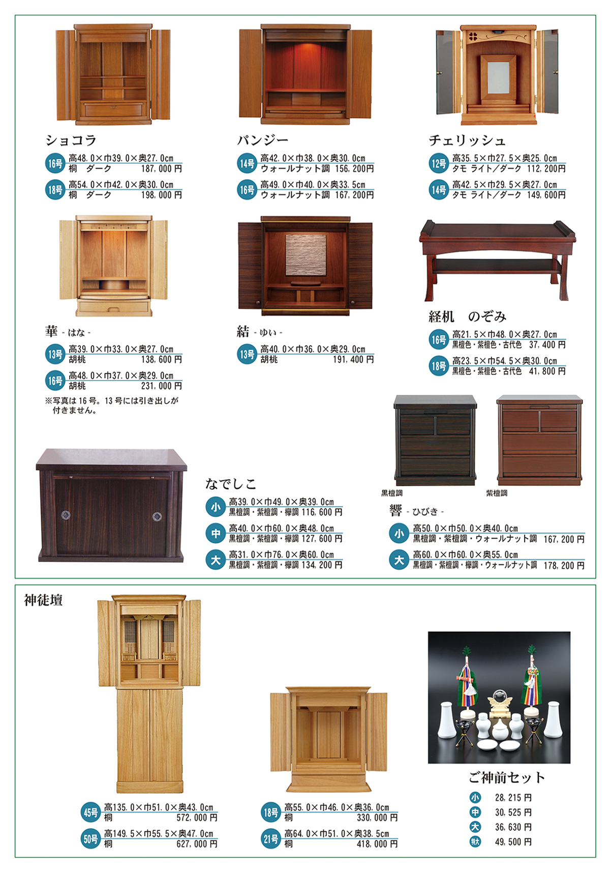 小型で家具の上に置ける為、上置仏壇(うわおきぶつだん)と言われております。リビングルームのサイドボ−ドやタンスの上に置けるように作られております。現代的な家具調仏壇や伝統的な唐木仏壇を小型にした様々なデザインの仏壇がございます。