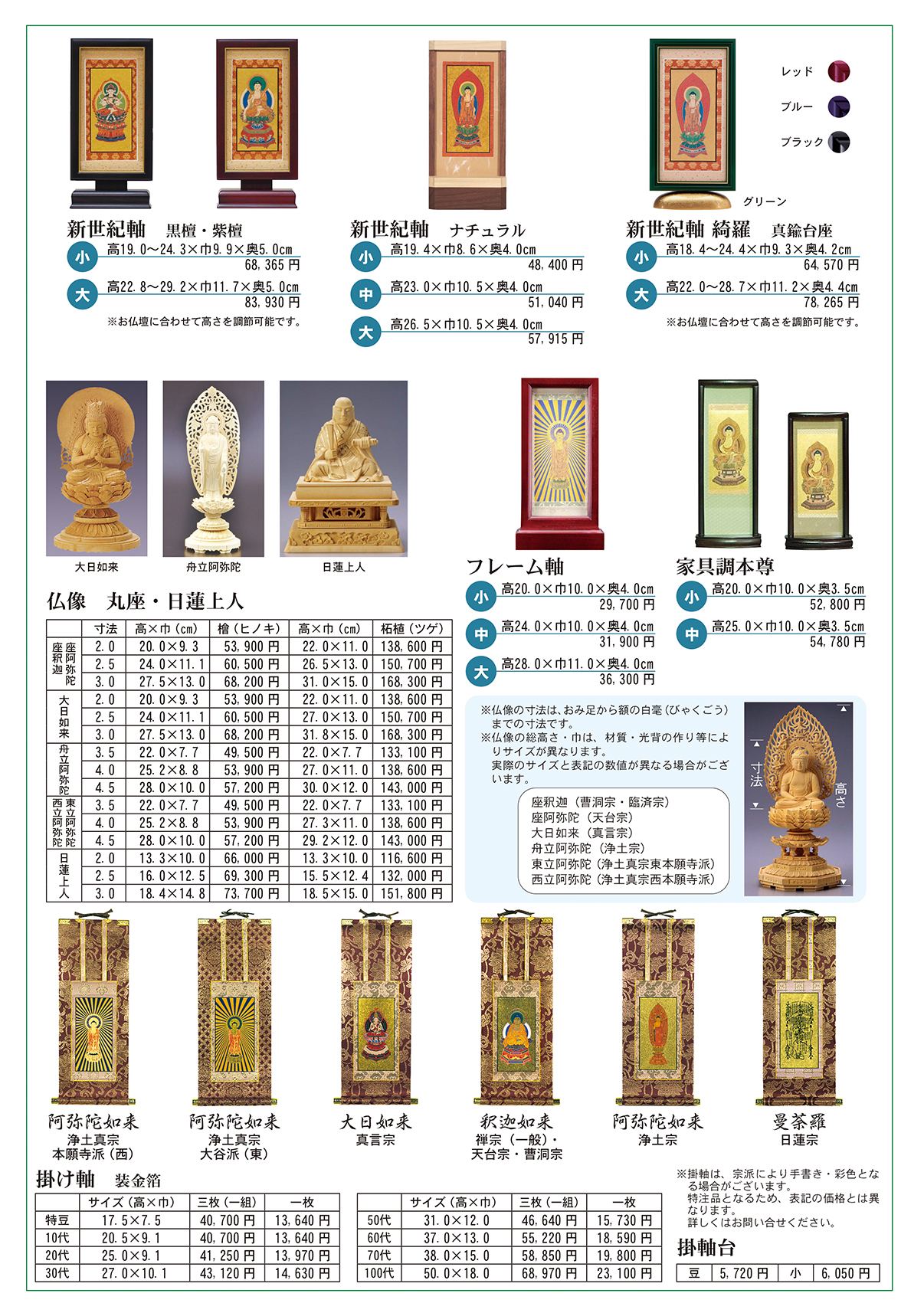 お仏壇に祀るご本尊は、仏像(彫刻品)と掛け軸(絵)の二種類があります。どちらを祀る場合でも、宗派に従った中尊(ちゅうぞん)と、その教えを補佐する脇侍(きょうじ・わきじ)を左右に、三尊仏(さんぞんぶつ)日蓮宗では三宝尊(さんぼうそん)をお祀りします。