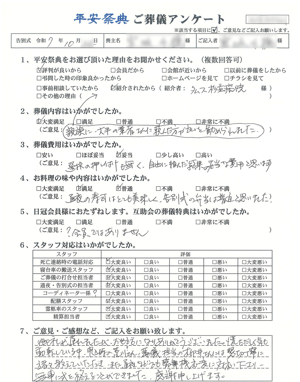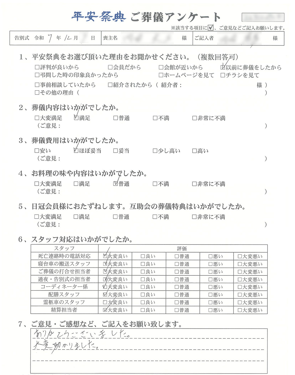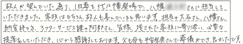 地元で長年信頼されている平安さんにお願いする以外に、考えはありませんでした。おかげさまで温かいお弔いが出来ました。皆様には心より感謝いたしております。