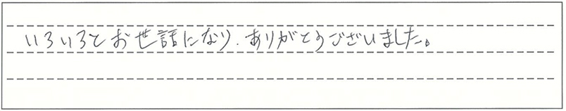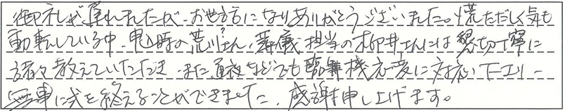 御礼が遅れましたが、お世話になり、ありがとうございました。慌ただしく気も動転している中、申込時の荒川さん、葬儀担当の柳井さんには懇切丁寧に諸々教えていただき、また通夜などでも臨機応変に対応下さり、無事に式を終えることができました。感謝申し上げます。