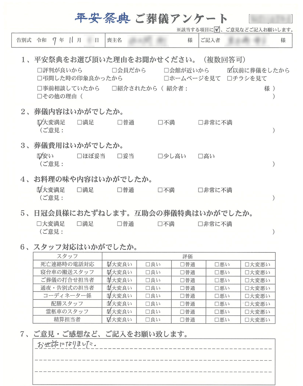 悲しみがいっぱいで何をどうしたらよいのか分からなくて、とても不安でしたがスタッフの方の対応が、とても丁寧で説明もわかりやすかったです。スタッフの方皆さん、とても話が聞き取りやすかったです。ありがとうございました。