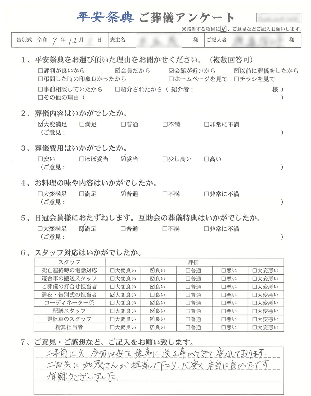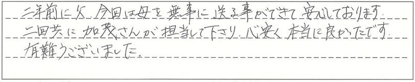 二年前に父、今回は母を無事に送ることができて、安心しております。二回共に加茂さんが担当して下さり、心安く本当に良かったです。有難うございました。