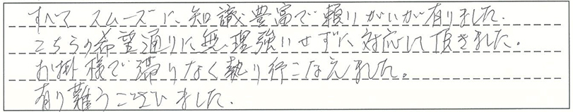 すべてスムーズに、知識豊富で頼りがいが有りました。こちらの希望通りに無理強いせずに対応して頂きました。