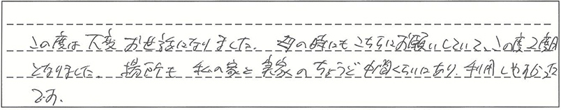 この度は大変お世話になりました。母の時にもこちらにお願いしていて、この度二度目となりました。場所も、私の家と実家のちょうど中間くらいにあり、利用しやすかったです。