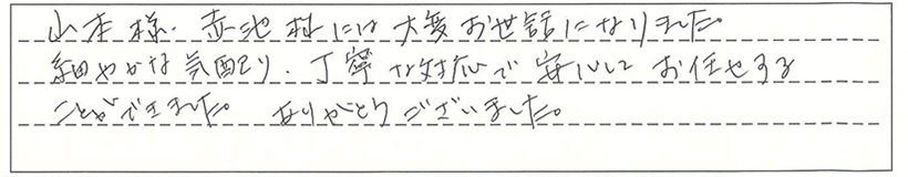 山本様、赤池様には大変お世話になりました。細やかな気配り丁寧な対応で、安心してお任せすることができました。ありがとうございました。