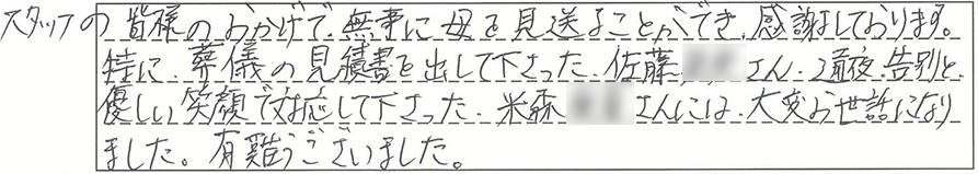 スタッフの皆様のおかげで、無事に母を見送ることができ感謝しております。特に葬儀の見積書を出してくださった佐藤さん、通夜、告別と優しい笑顔で対応して下さった、米森さんには大変お世話になりました。ありがとうございました。