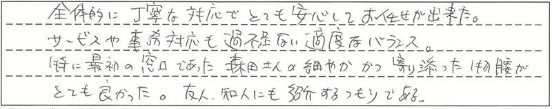 全体的に丁寧な対応でとても安心してお任せができた。サービスや事務対応も過不足ない適度なバランス。特に最初の窓口であった森田さんの細やかかつ寄り添った物腰がとても良かった。友人・知人にも紹介するつもりである。