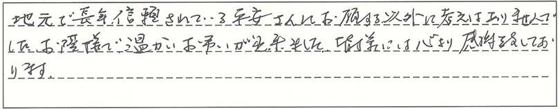 地元で長年信頼されている平安さんにお願いする以外に、考えはありませんでした。おかげさまで温かいお弔いが出来ました。皆様には心より感謝いたしております。