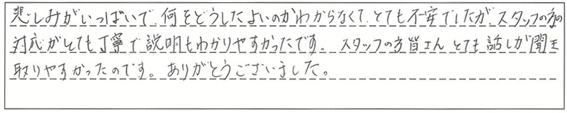 悲しみがいっぱいで何をどうしたらよいのか分からなくて、とても不安でしたがスタッフの方の対応が、とても丁寧で説明もわかりやすかったです。スタッフの方皆さん、とても話が聞き取りやすかったです。ありがとうございました。