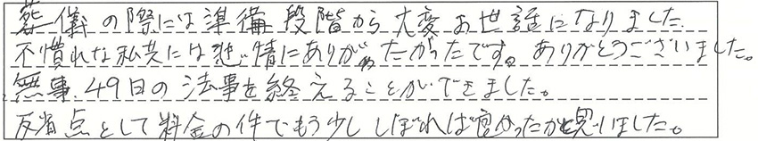 葬儀の際には準備段階から、大変お世話になりました。不慣れな私共には非常にありがたかったです。ありがとうございました。無事49日の法要を終えることができました。反省点として料金の件で、もう少ししぼれば良かったかと思いました。